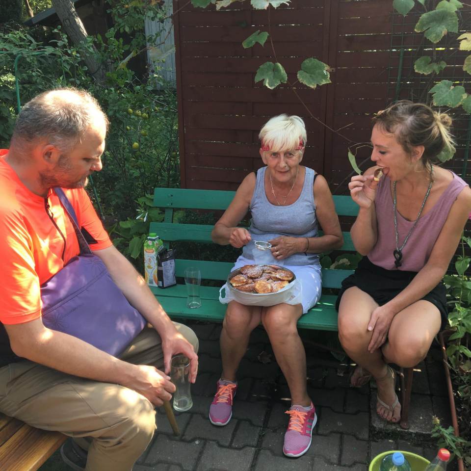 Halina: Skąd działka? Bo lubimy grzebać w ziemi i lubimy mieć swoje warzywa. Ja mogę cały dzień siedzieć na działce i grzebać w ziemi. Naprzeciwko mojego mieszkania jest blok i ja nie chcę siedzieć na balkonie i patrzeć w czyjeś okna. Tutaj sobie przyjdę z samego rana, podłubię, posiedzę, pogadamy z sąsiadką. Gotujemy tutaj też obiady, bo mamy butlę z gazem. Jak przychodzimy, to siedzimy do oporu. Na działkę mamy bardzo blisko, przechodzimy Ossowskiego, po skosie i jest bliziusieńko.
