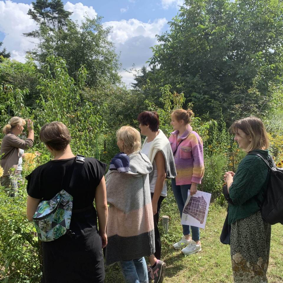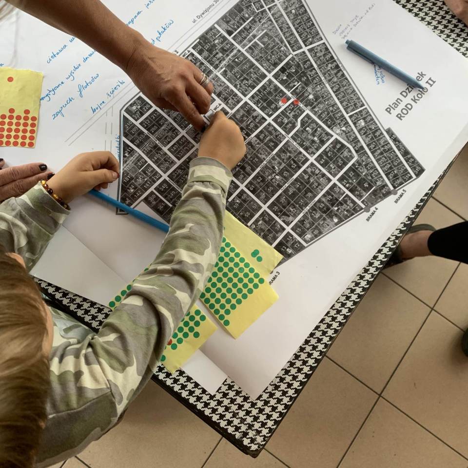 Mapowanie krajobrazu ROD Koło II w ramach warsztatu o pamięci roślin prowadzonego przez Darię Szarejko-Worobiej. Wydarzenie to część cyklu Pamięć krajobrazu Osiedla Koło II organizowanego przez Muzeum Szklanych Domów działające przy Wolskim Centrum Kultury.