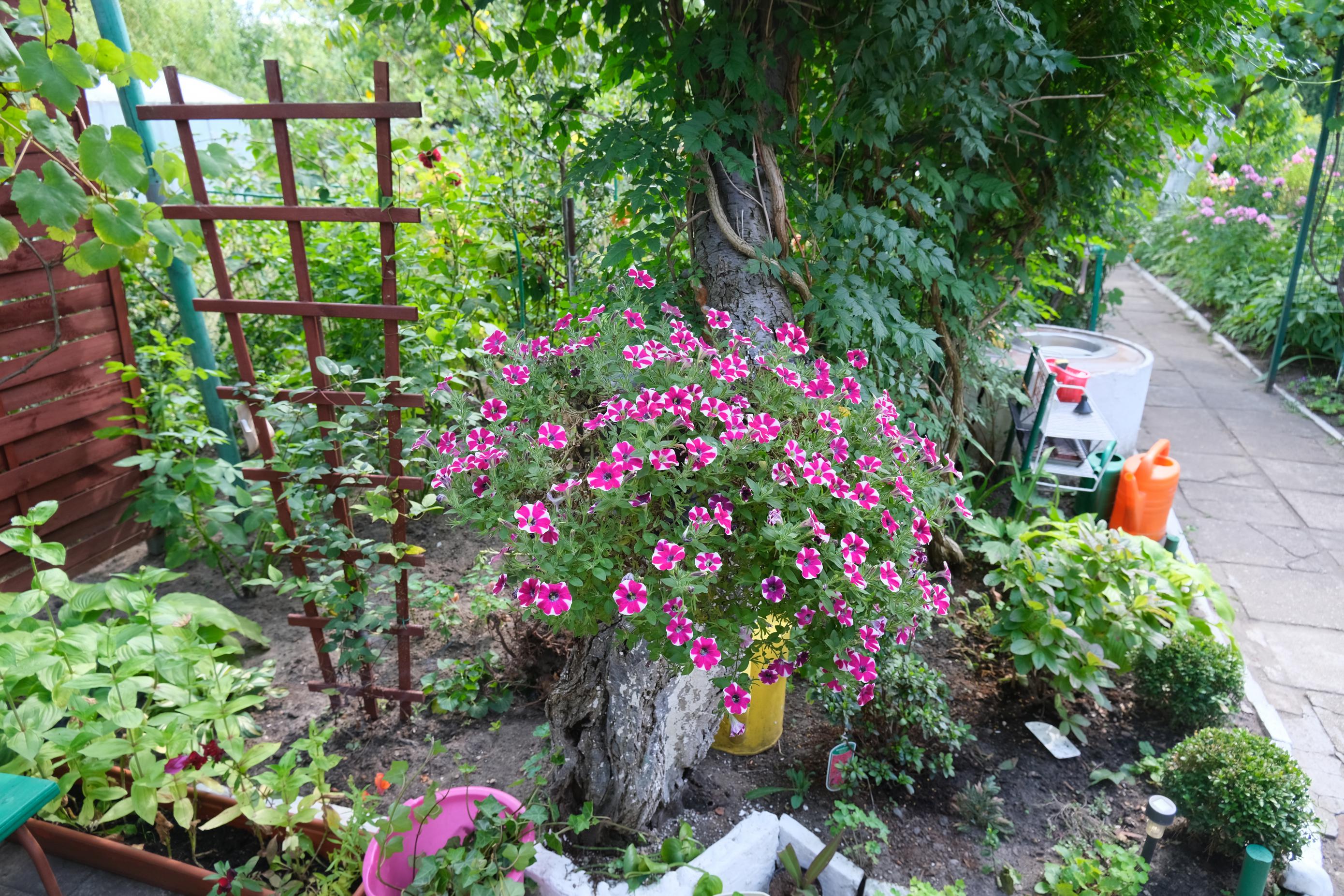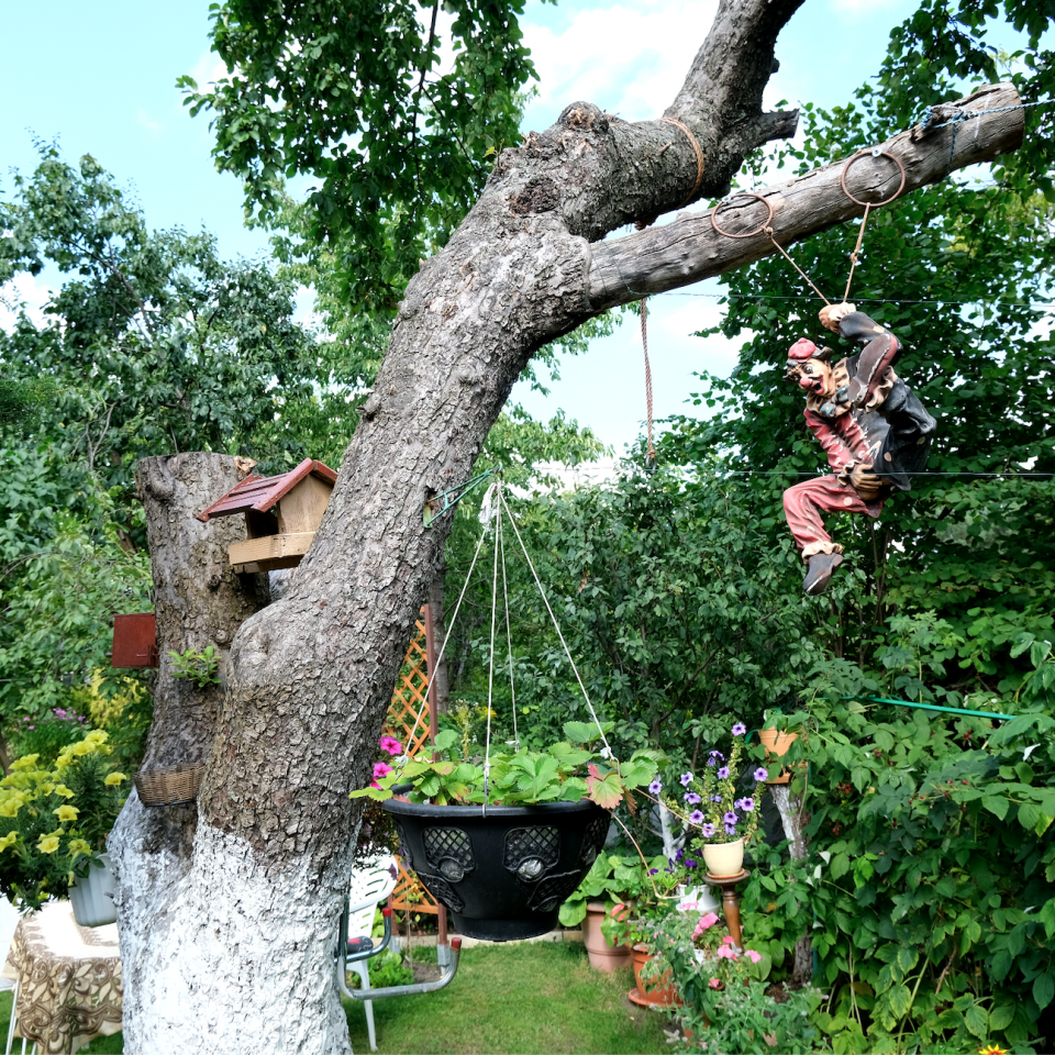 H: Cały balkon był w kwiatach. Ludzie jak przechodzili, to się oglądali. Tutaj na działce stała taka grusza, ale była chora od jałowca i ciągle musiałam grabić liście. Mówię do męża chodź zetniemy tę gruszę, a ja sobie zrobię kwietnik.