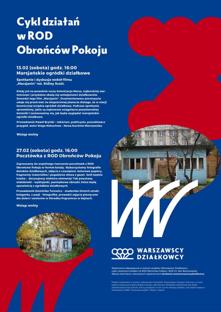 Zapraszamy na dwa lutowe wydarzenia w Domu Działkowca w ROD Obrońców Pokoju na Mokotowie. Pierwsze spotkanie będzie kosmiczne ! Paweł Brylski opowie nam o ziemniakach w hubie i sałacie ledowej, a punktem wyjścia będzie film Marsjanin Ridley'a Scott'a (Marsjańskie ogródki działkowe - 13.02.2016 / sobota, godz. 16:00). Dwa tygodnie później spotkamy się z Dominiką Turowicz, która wprowadzi nas w przyjemną sztukę tworzenia kolaży. Inspiracją będą zdjęcia altan działkowych z ROD Obrońców Pokoju. Pocztówka z działki - 27.02.2016 / sobota, godz. 16:00