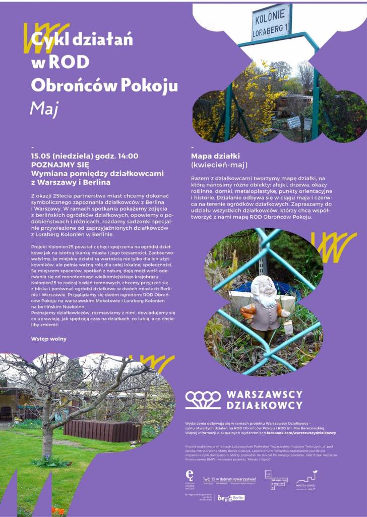 15 maja o godz. 14:00 spotkamy się prze Domem Działkowca na wymianie roślin i sadzonek przywiezionych z berlińskich działek. Poznajmy się to wydarzenie, podczas którego dokonamy symbolicznego zapoznania działkowców z Berlina i Warszawy. W ramach spotkania pokażemy zdjęcia z berlińskich ogródków działkowych, opowiemy o podobieństwach i różnicach, rozdamy sadzonki specjalnie przywiezione od zaprzyjaźnionych działkowców z Loraberg Kolonien w Berlinie. Projekt Kolonien 25 tworzony przez Ninę Scholz i Dominikę Bok, powstał z chęci spojrzenia na ogródki działkowe jak na istotną tkankę miasta i jego tożsamości. "Zaobserwowałyśmy, że miejskie działki są wartością nie tylko dla ich użytkowników, ale pełnią ważną rolę dla całej lokalnej społeczności. Są miejscem spacerów, spotkań z naturą, dają możliwość oderwania się od monotonnego wielkomiejskiego krajobrazu. Kolonien25 to rodzaj badań terenowych, chcemy przyjrzeć się z bliska i porównać ogródki działkowe w dwóch miastach Berlinie i Warszawie. Przyglądamy się dwóm ogrodom: ROD Obrońców Pokoju na warszawskim Mokotowie i Loraberg Kolonien na berlińskim Nuekoelln. Poznajemy działkowiczów, rozmawiamy z nimi, dowiadujemy się, co uprawiają, jak spędzają czas na działkach, co lubią, a co chcieliby zmienić".