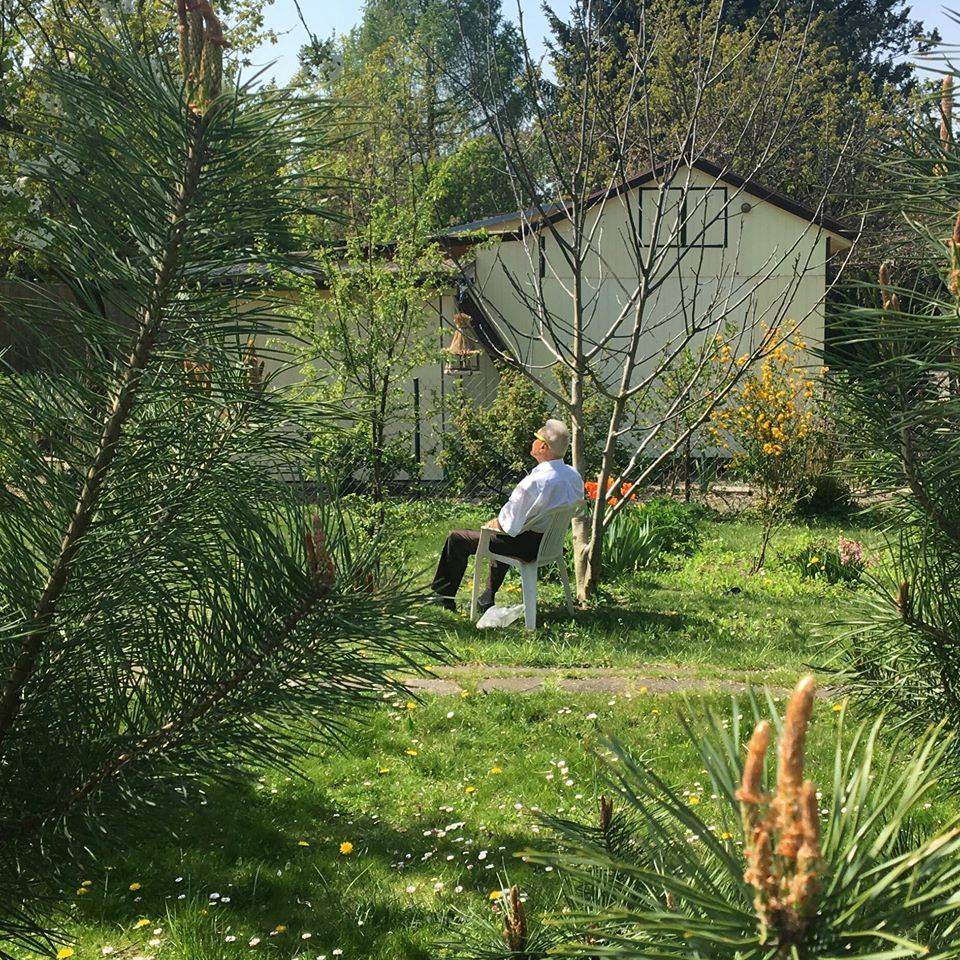 Jak widać, nawet jestem opalony. Lubię tutaj siedzieć, myśleć i przypominać sobie różne dobre rzeczy. Czasem pogadam z sąsiadem czy z sąsiadką, niekiedy spacerowicze do mnie zagadają. Mieszkam bardzo blisko stąd i zawsze przychodziłem tu na spacery z żoną, zanim jeszcze mieliśmy tutaj działkę. Kiedyś było tutaj więcej ławek więc spacerowicze mogli sobie usiąść w ogrodzie. Później te ławki zabrano, a ja uważam, że powinno ich być więcej. Szczególnie starszym ludziom są one potrzebne.