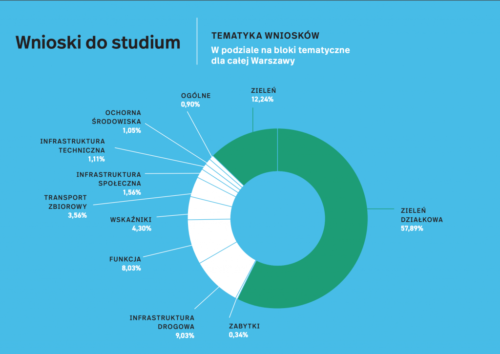Powyższy diagram prezentuje liczbę wniosków do Nowego Studium. Prawie 60% z ok. 25 tysięcy to wnioski dotyczące zieleni działkowej.