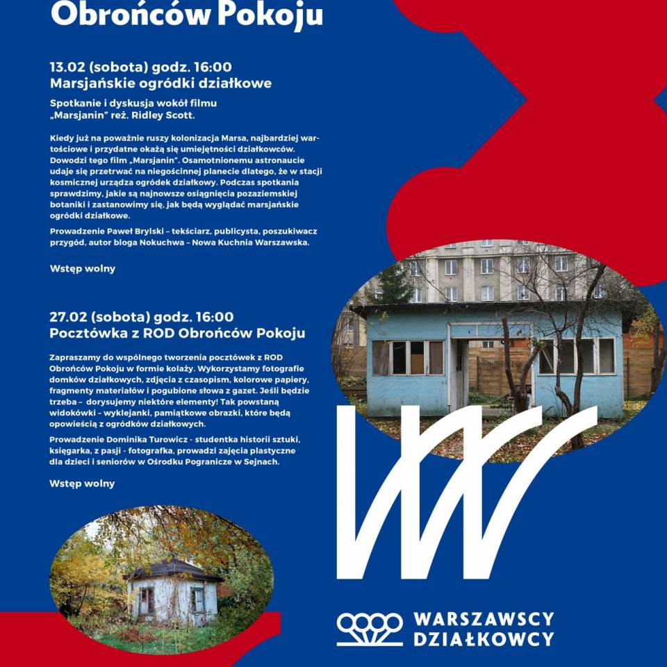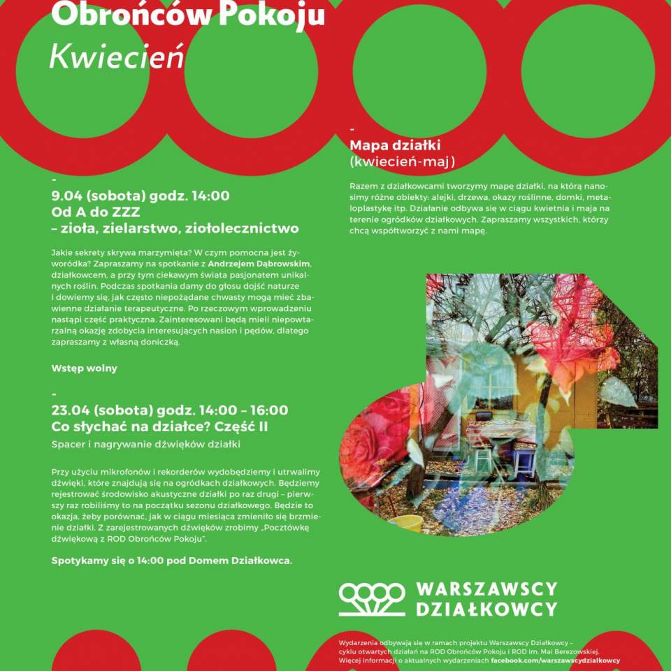 Kiedyś pojawił się pomysł, żeby fajnie spędzić czas w mieście. Odkryć nieznany ląd i trochę się tam zgubić, a przy okazji dowiedzieć się czegoś nowego o świecie. Tak powstali "Warszawscy Działkowcy" inicjatywa, która zaczęła się w Rodzinnym Ogrodzie Działkowym im. Obrońców Pokoju na Mokotowie jesienią 2015 roku. W ciągu kilku miesięcy bycia w ogrodzie - nagrywania dźwięków, dokumentowania architektury działkowej i poznawania lokalnych historii i plotek, udało nam się wspólnie z działkowcami i Zarządem ogrodu zaprosić tam mieszkańców. Czasem było śmiesznie, czasem strasznie. Niejednokrotnie omyłkowo zamykano nas nocą w ogrodzie. Do sierpnia 2016 roku zbieraliśmy materiał na przewodnik po ogrodzie i realizowaliśmy otwarte spotkania w Domu Działkowca i spacery po ogrodzie. Jako 12-osobowy zespół znajomych, przypadkowych nieznajomych i działkowców z Obrońców Pokoju, zorganizowaliśmy łącznie dziewięć wydarzeń w Domu Działkowca i w ogrodzie. Prowadziliśmy wywiady, rejestrowaliśmy dźwięki działki, tworzyliśmy mapę, wymienialiśmy się sadzonkami i nasionami, robiliśmy kolaże inspirowane ROD „Obrońców Pokoju”, prowadziliśmy pogadanki.